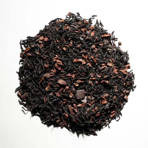 Té negro de China con cacao. Mezcla de té con toque dulce a cacao, muy apetecido para la hora del té, acompañamiento de repostería, entre comidas y su cálido sabor lo transforma en un favorito cuando hace frío.