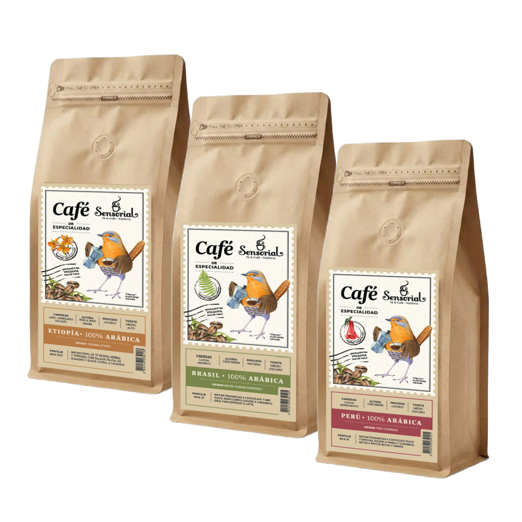 Café de Especialidad de 3 Orígenes, 100% Arábica: Etiopía, Perú y Brasil, 1 Kg de cada uno. Total 3 Kg.