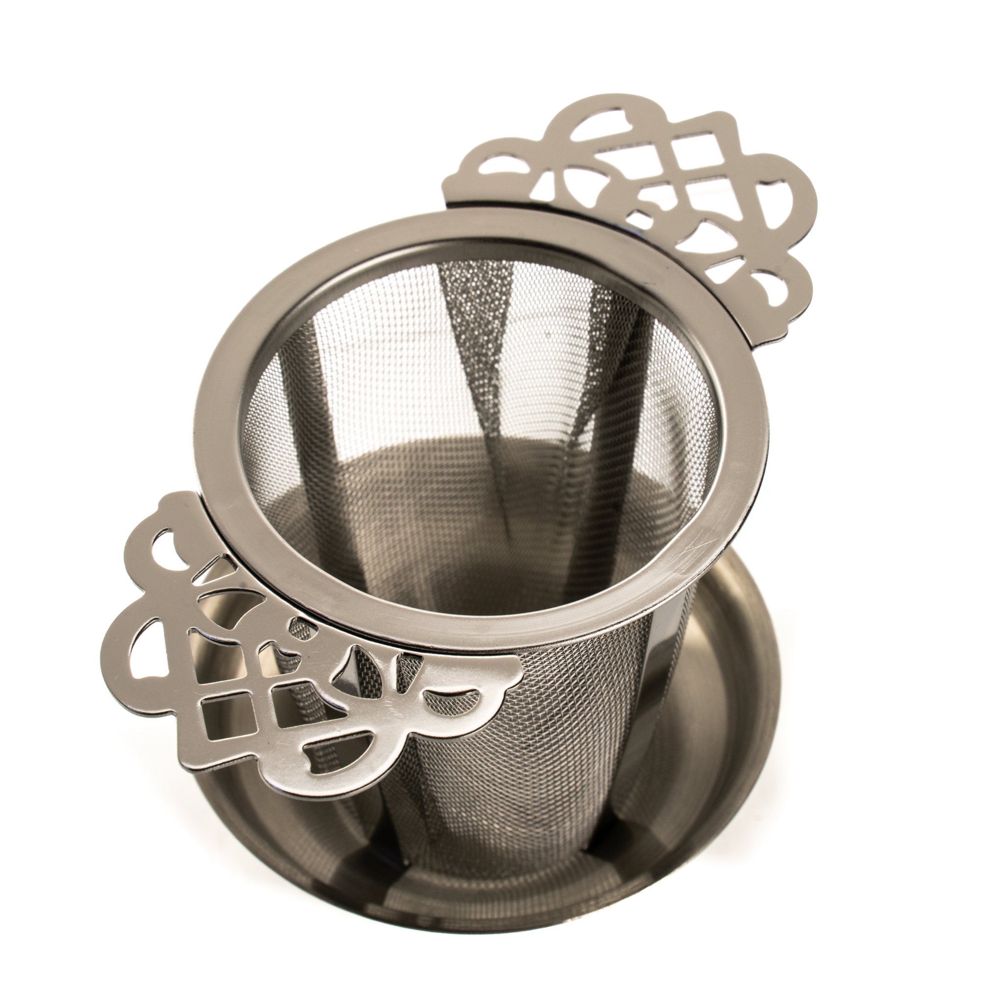 Colador Antiguo con soporte y pedestal, material inoxidable. Se acomoda a cualquier taza o tazón. Es muy práctico y de alta durabilidad. Puedes incluso preparar grandes jarras e ir sirviendo y filtrando de taza en taza.
