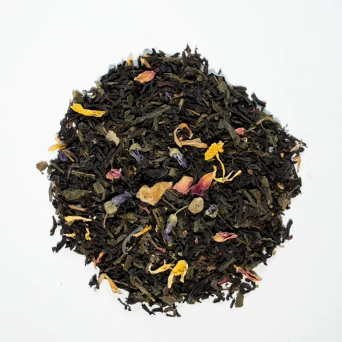Té negro, té verde Sencha, papaya, pétalos de rosa, malva, safflor, pasas y un toque de berries rojos.