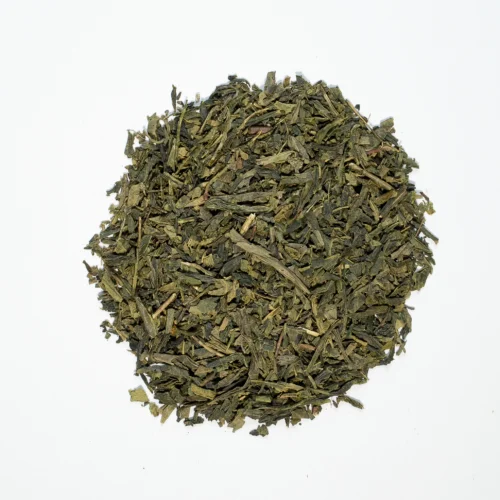 Té verde Sencha de China, color ámbar. Este clásico té es de hoja larga y angosta, suave sabor amargo, pero herbal, ideal para tomar solo o mezclar con otras hierbas aromáticas o frutos.
