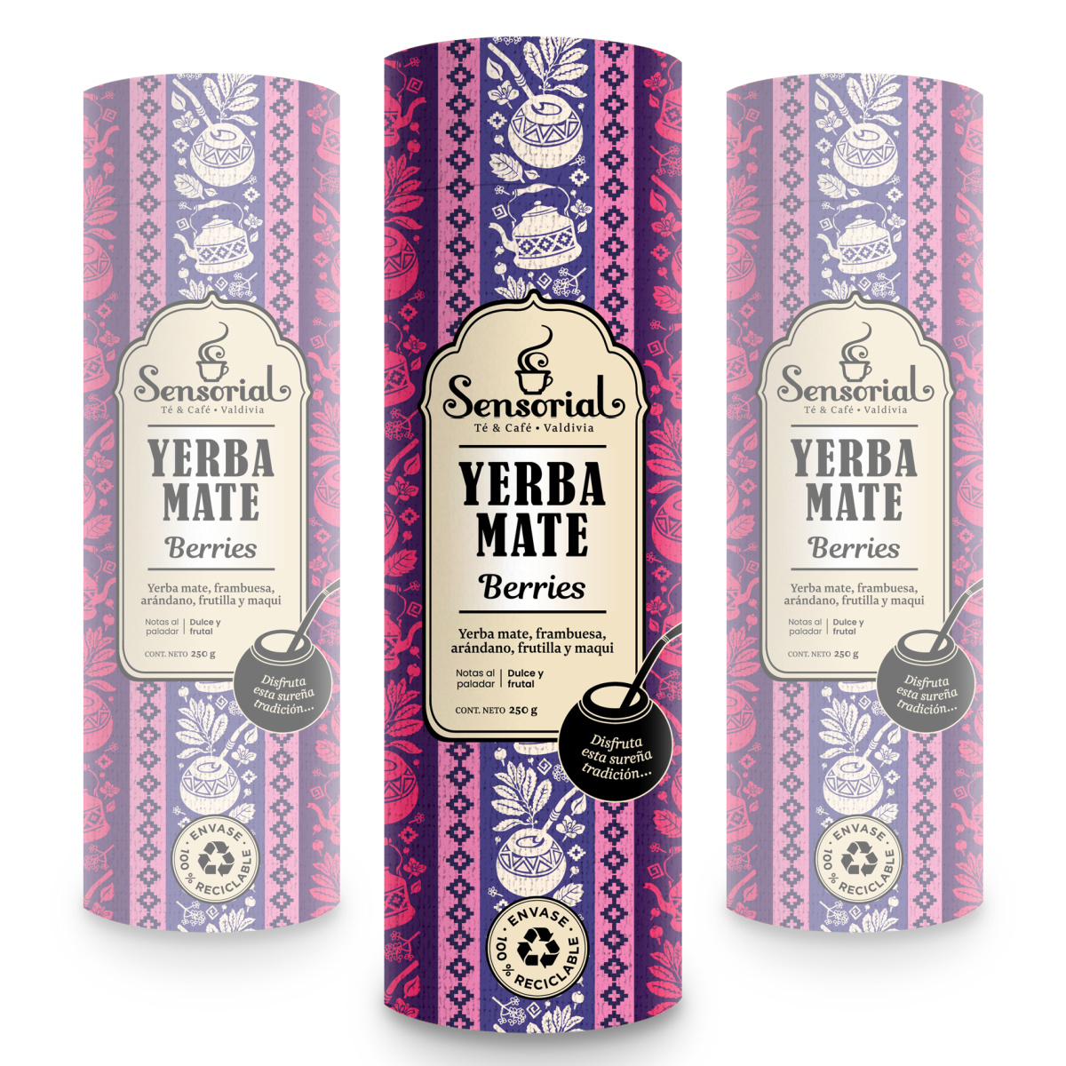 Yerba mate Argentina con palo, frambuesa, arándano, frutilla y maqui. Presentación en Tarro reciclable y reutilizable de 250g.